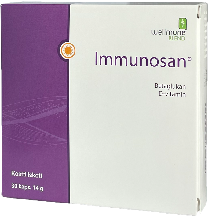 Patenterat Wellmune® Blend betaglukan (ej EU), Vegetabiliskt kapselskal HPMC, Klumpförebyggande medel mikrokristallin cellulosa och kiseldioxid, D3 vitamin kolekalciferol från lav (ej EU), Ytbehandlingsmedel magnesiumsalter av fettsyror.